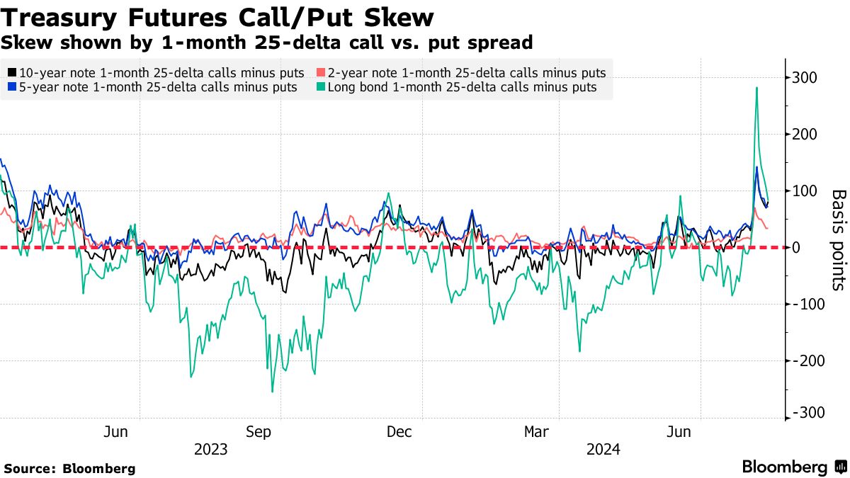 在国债期权市场,与期货市场类似,交易者已从极端位置撤退,尽管定位表明对较低收益率的预期仍然保持不变。根据所谓的期权偏斜,交易者押注未来几天债券市场反弹的机会大于抛售。
