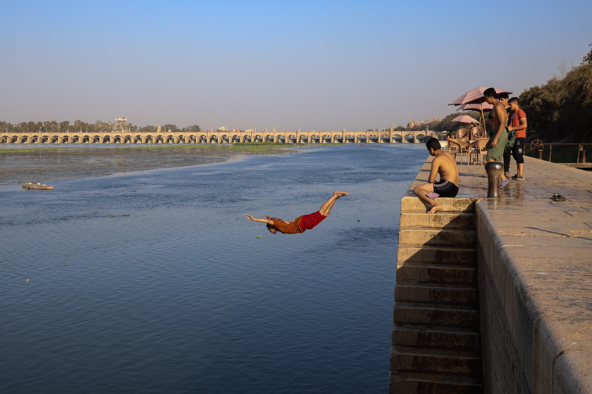 年轻人在埃及开罗郊区的阿尔卡纳特尔哈伊雷亚的尼罗河岸边消暑,时间是2024年6月7日,气温很高。摄影师:伊斯兰·萨夫瓦特/彭博社