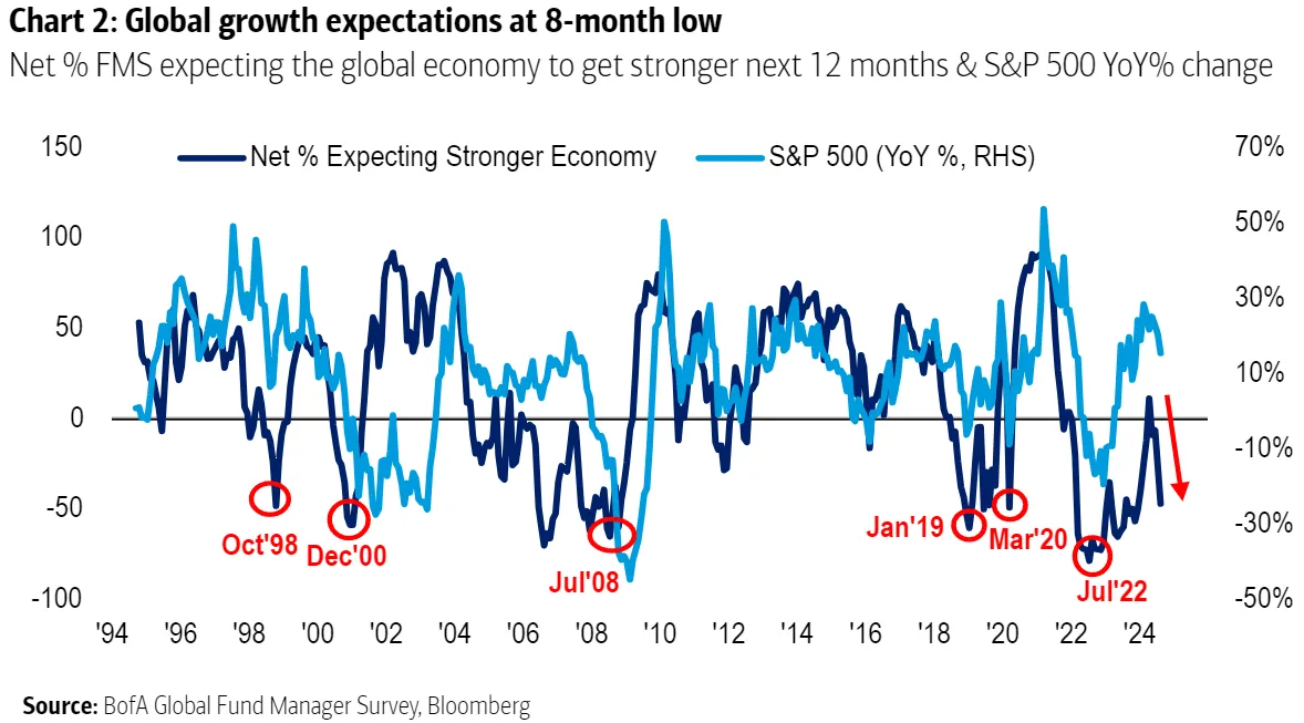 这增加了对高管在第二季度财报电话会议上的发言的调查,以及纽约联邦储备银行对消费者预期的月度调查,表明对经济衰退的焦虑实际上在减少,而在此期间市场投资者却对这种可能性感到恐慌。我们现在还有来自美国银行的全球基金经理的及时调查,该调查在8月2日(当时美国就业数据略显失望,东京的抛售开始真正加剧)和8月8日之间进行。自然,他们对经济强劲复苏的希望受到了打击,这种情况通常会导致股市出现更大幅度的下跌: