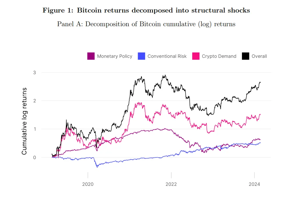 尽管价格飙升,机构化仍处于初期阶段。然而,日益增长的采用已经改变了比特币作为资产类别的表现。 这项研究由 Austin Adams来自Uniswap Labs, Markus Ibert来自哥本哈根商学院,以及 Gordon Liao来自Circle Internet Financial发现,传统的风险和货币政策因素对加密资产价格有显著影响——就像它们对债券和股票的影响一样。这引发了关于加密资产是否能够对冲通货膨胀或提供价值储存的问题。在这张图表中,研究人员将比特币收益分解为三种结构性冲击——传统货币政策冲击、传统风险溢价冲击和加密特定需求冲击: