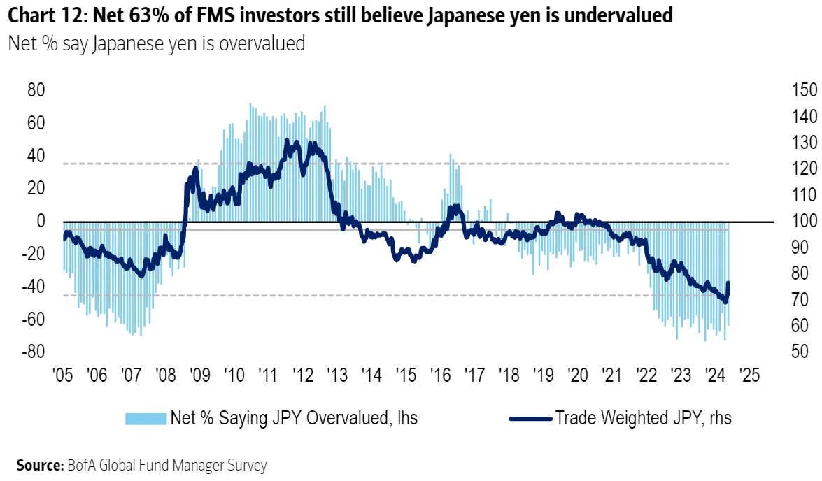 彭博社观点天气的转变:来自世界农场的好消息劳斯莱斯首席执行官证明你不需要私募股权就能致富Chipotle的首席执行官将为星巴克带来一些风味汽车制造商Ola Electric的首次公开募股正在考验莫迪经济学日元套利交易——以低廉的日元借款并将资金停放在其他地方以从差价中获利的策略——被美银的调查受访者视为还有进一步解开的空间。在日本货币历史上最剧烈的上涨之一期间,大多数人仍然认为日元被低估: