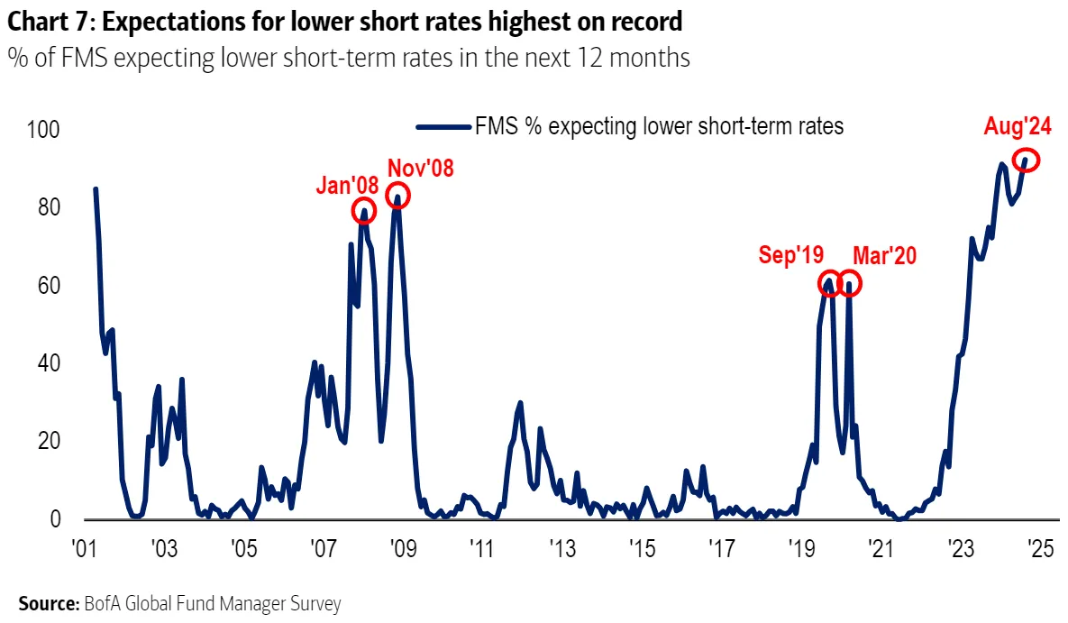 为什么如此自信?因为他们确信短期利率很快会下降(尽管美联储官员的点阵图预测明确表明了相反的情况)。事实上,他们对即将降息的信心比本世纪的任何时候都要强: