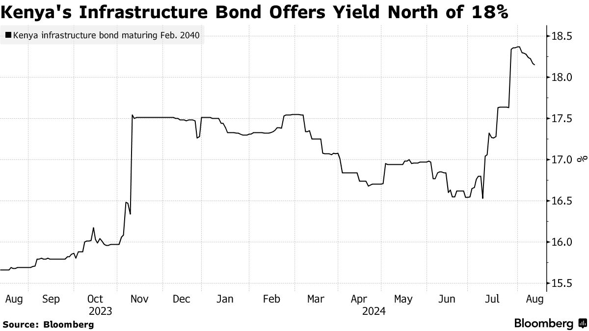 尽管财政部表示正在尝试恢复一些税收措施,但预算赤字的担忧依然存在,推动投资者对持有肯尼亚资产的溢价需求上升。基础设施债券——为融资发展项目而推出的免税证券——也不例外,自6月中旬抗议活动爆发以来,2040年到期的现有债券收益率上升了140个基点。该债券目前的收益率约为18.16%,高于2023年4月最后一次发行时的14.41%。