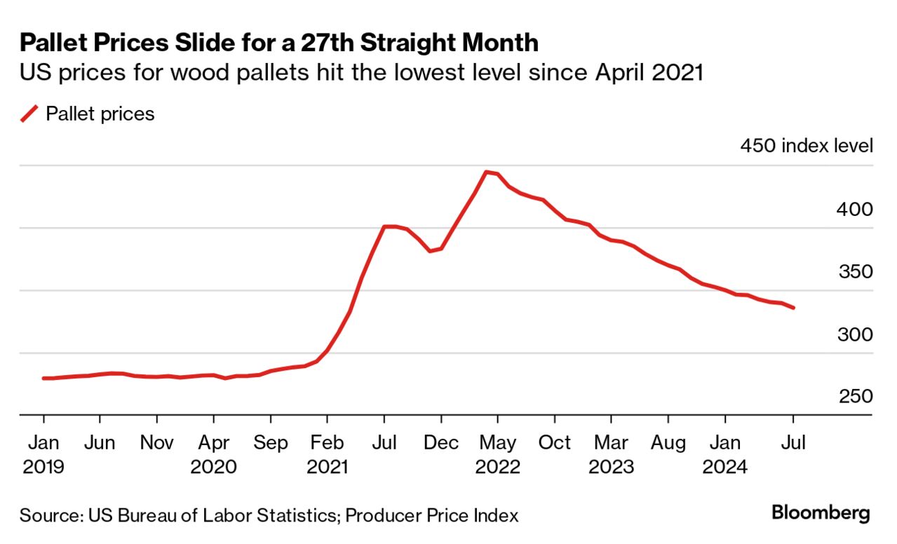 批发通货膨胀 | 美国的托盘价格连续第27个月下降。最新的托盘成本跟踪指标——这些用于运输单位负载的木质平台——是周二关于7月份整体生产者价格报告的一部分,该报告显示价格上涨幅度低于预期。在疫情期间,托盘价格 在2022年4月达到了创纪录的高点*,当时对商品的需求强劲。美国劳工统计局数据显示,上个月最终需求的生产者价格指数比上个月上涨了0.1%。*