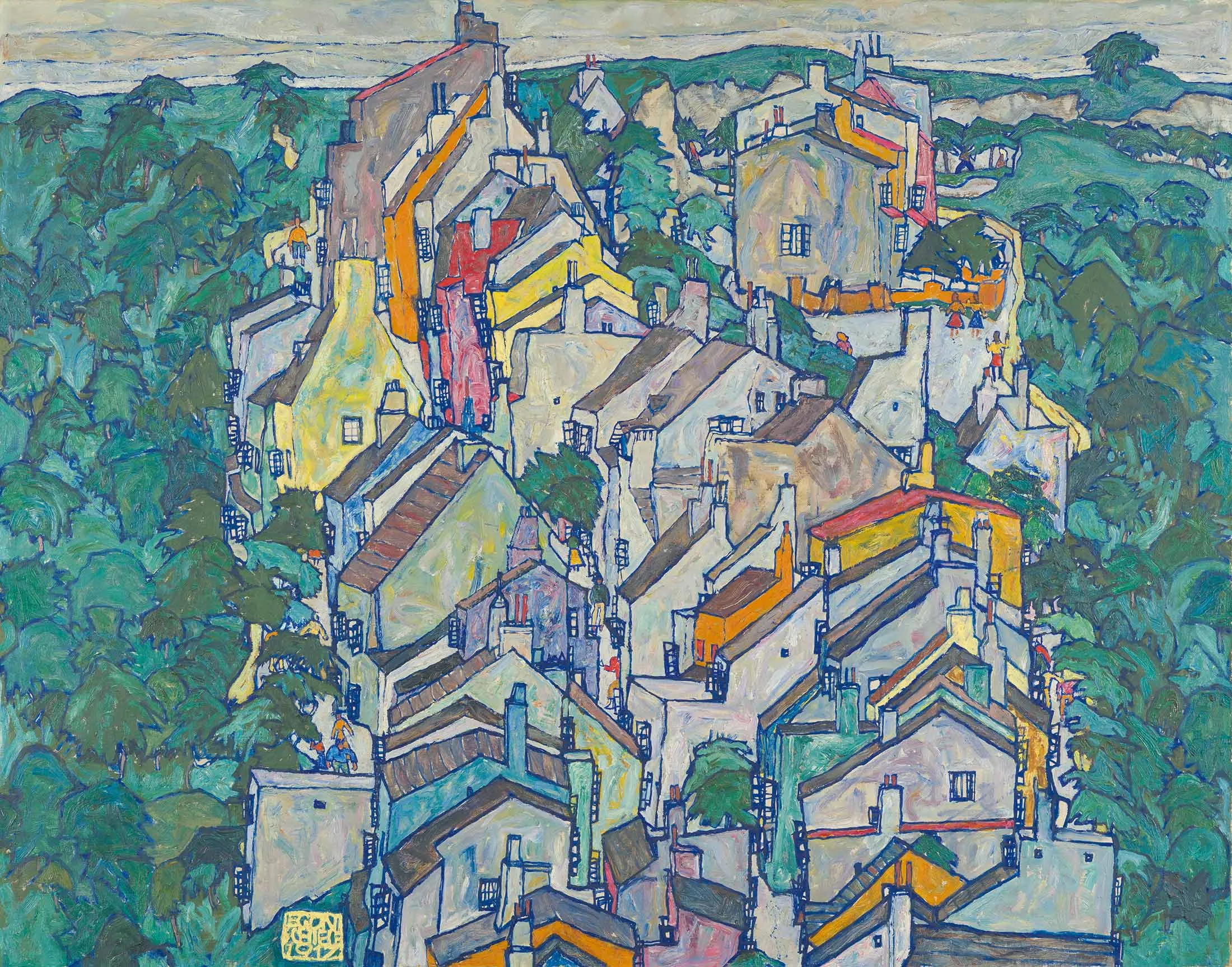 埃贡·席勒的 绿意中的城镇(旧城III),1917年感谢新画廊埃贡·席勒:生动的风景你知道他肖像画的尖锐、消瘦的色情魅力,但你可能没有见过席勒那壮观的风景画——可以说更令人印象深刻的是他如何赋予无生命的物体同样的焦虑和美感。新画廊纽约,10月17日 – 1月13日