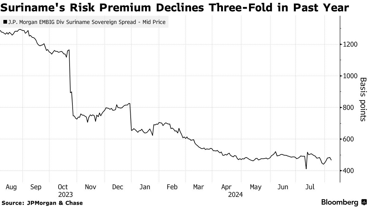根据彭博社汇编的数据,苏里南债券在过去一年表现优异,为投资者带来了14.7%的回报,而新兴市场同行的平均回报为5%。投资者要求持有这些债券相对于类似美国国债的额外收益率今年已下降近200个基点,降至479个基点,根据摩根大通的数据。