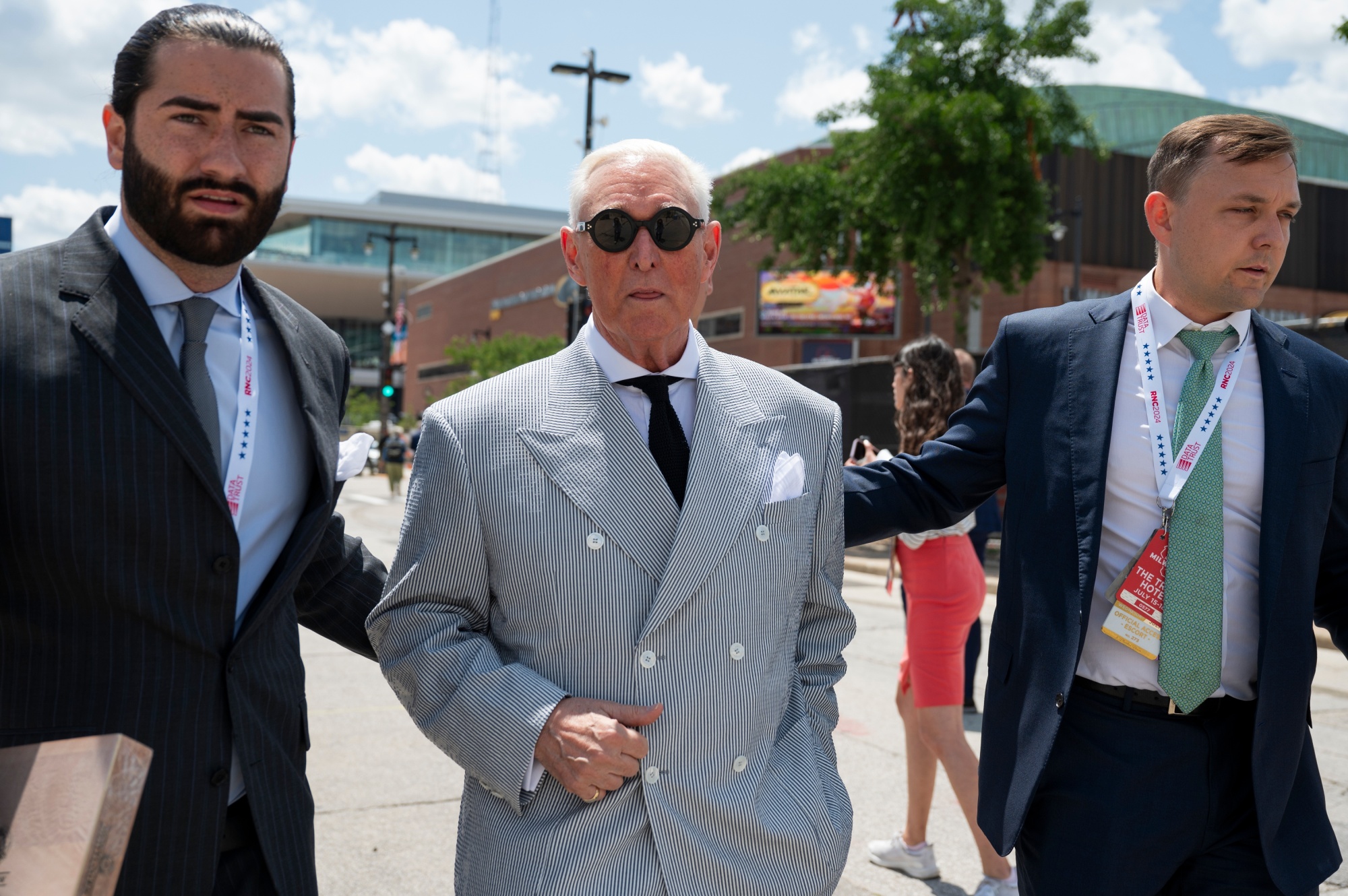 罗杰·斯通,前唐纳德·特朗普总统竞选顾问,中央,在共和党全国大会期间。