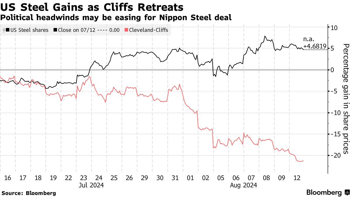 摄影师:贾斯廷·梅里曼/彭博社美国钢铁公司在股市中表现优于同行,因为投资者猜测对其141亿美元收购日本钢铁公司的政治和劳工反对可能正在减弱。