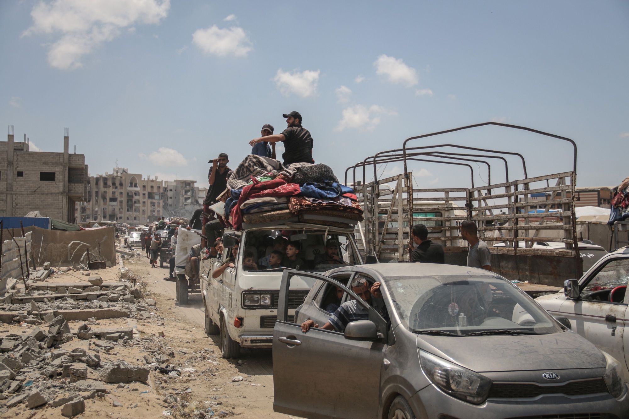 被迫撤离的巴勒斯坦人在2024年8月11日星期日,因以色列军队的撤离命令而逃离加沙南部的哈马德区。照片:阿赫迈德·萨利姆/彭博社