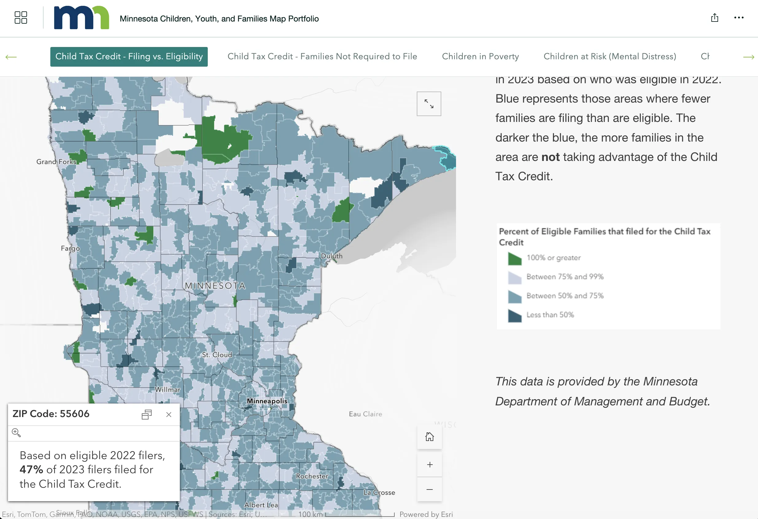 儿童税收抵免申报率地图的截图,属于明尼苏达州地图组合的一部分。Walz表示,他的政府建立了地图以确定能够受益的社区,然后在这些地方进行宣传,以确保人们报税。“我们在杂货店门口设置了临时报税点,”他说。“我们几乎是逐户上门。”