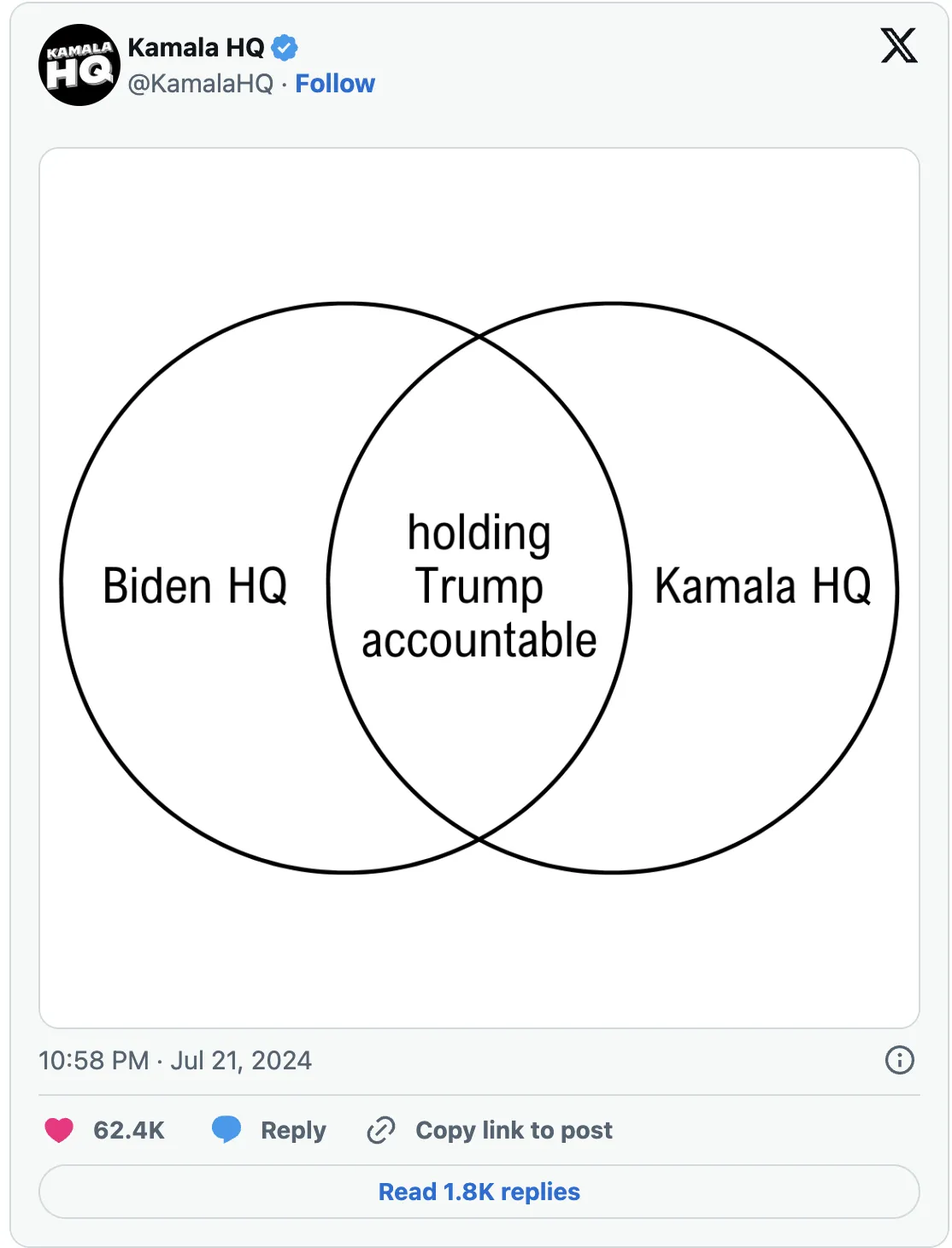 Walz对地图的欣赏与副总统哈里斯常提到的对维恩图的热爱相结合,形成了历史上最注重数据可视化的竞选组合之一。在拜登总统宣布放弃连任竞选的那天,哈里斯宣布她将参选,哈里斯竞选团队在X上发布了一张维恩图,传达了候选人的核心信息之一。