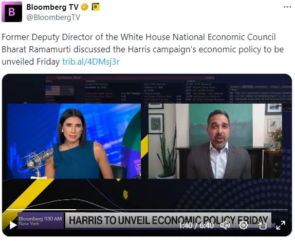 今天在彭博电视台的 权力的平衡 早间版中,主持人乔·马修和凯莉·莱因兹采访了白宫国家经济委员会前副主任巴拉特·拉马穆尔提,讨论哈里斯在税收和财政政策方面的议程。
