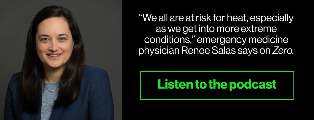 健康与气候变化的交集是一个日益增长的研究领域,且愈发紧迫:例如,预计到本世纪中叶,老年人因热而死亡的数量将增加370%。本周在零中,阿克沙特·拉提与马萨诸塞州总医院和哈佛医学院的急诊医学医生、全球变暖健康影响的领先专家蕾妮·萨拉斯进行了对话。“我希望每个人都能带走的信息是,我们都面临风险,”萨拉斯说,“尤其是当我们进入越来越极端的条件时。”现在收听,并在苹果或Spotify上订阅,以便每周四获取新剧集零。