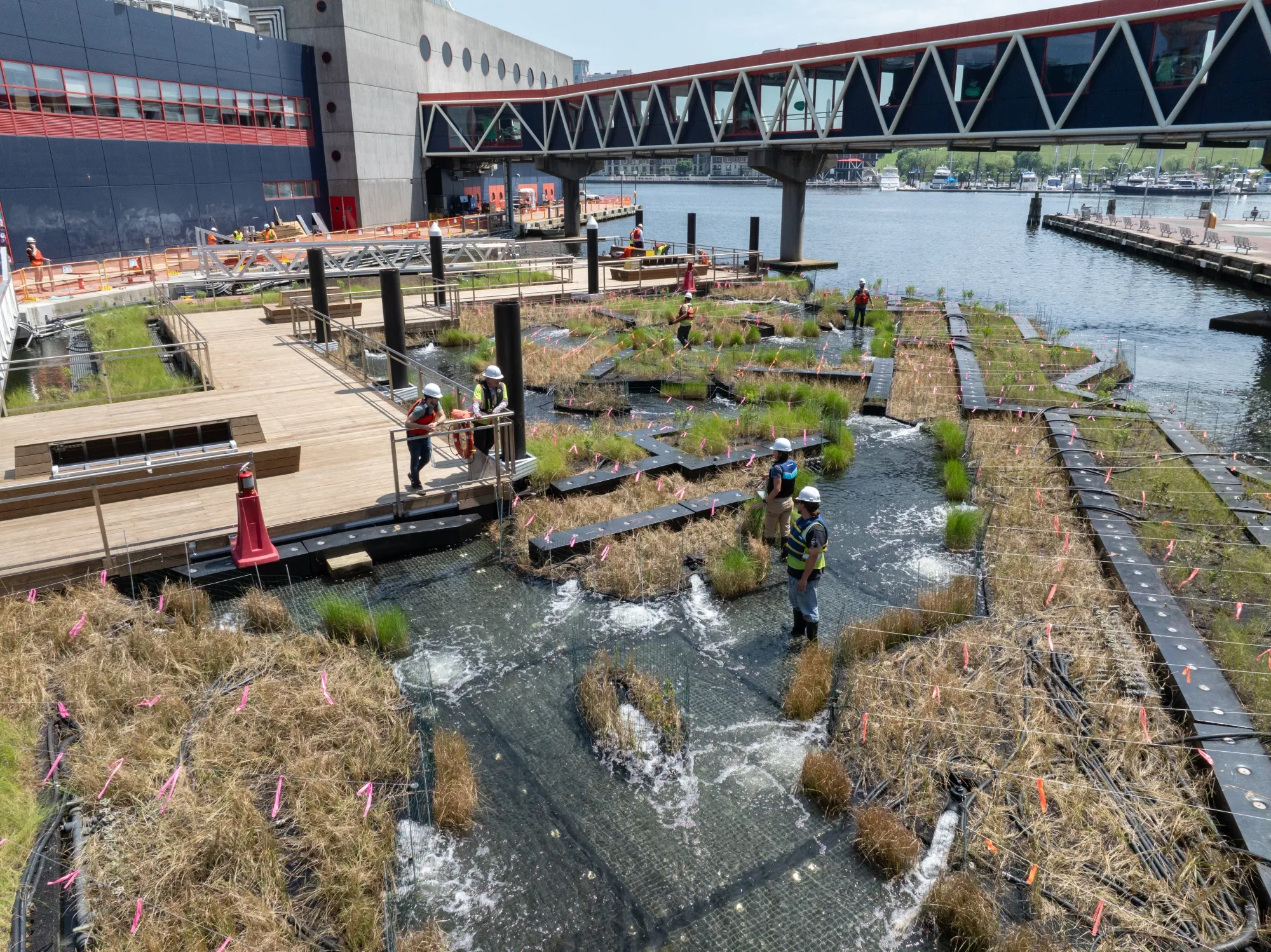 建筑师和水族馆工作人员设计了一种新颖的浮筒技术,以创建一个人工版本的自然湿地,这些湿地曾定义该地区的海岸线。现在,这个价值1400万美元的项目拥有多层地形和多样的种植表面,已经吸引了软体动物、鱼类和海鸟等生物。在营业时间内,这片湿地还作为一个自由漂浮的公园,设有高架步道、座位和遮阳结构,旨在吸引陆地游客。