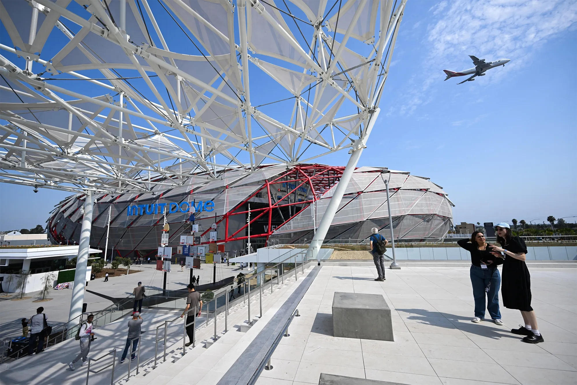 Intuit Dome是一个巨大的私人开发综合体的最新拼图,位于前好莱坞公园赛马场的场地上,英格尔伍德市人口超过10万,位于洛杉矶外。它位于世纪大道对面,那里是一个价值55亿美元的圆形剧场SoFi Stadium,由洛杉矶公羊队老板斯坦·克伦克私人融资,并于2021年开放,成为公羊队和洛杉矶充电队的主场。