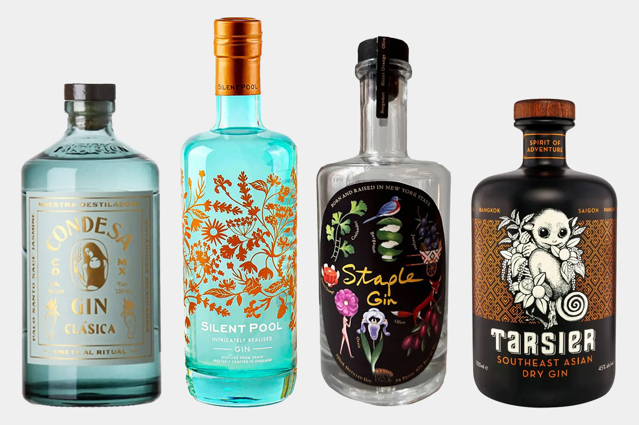 从左到右:Condesa Gin Clásica、Silent Pool Gin、Staple Gin、Tarsier东南亚干金酒。来源:供应商Condesa Gin Clásica **($47):**这是来自墨西哥城的女性拥有品牌,这款金酒庆祝在墨西哥疗愈仪式中使用的植物成分,称为curandera,因此巴洛圣木、没药和茉莉花与更传统的风味相结合。鼠尾草、橙子和青柠皮让我印象深刻,调配成一杯令人愉悦的金汤力。
