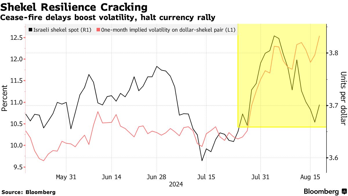 以色列谢克尔(美元/以色列谢克尔)下滑,因难以实现的停火导致波动性上升 - 彭博社