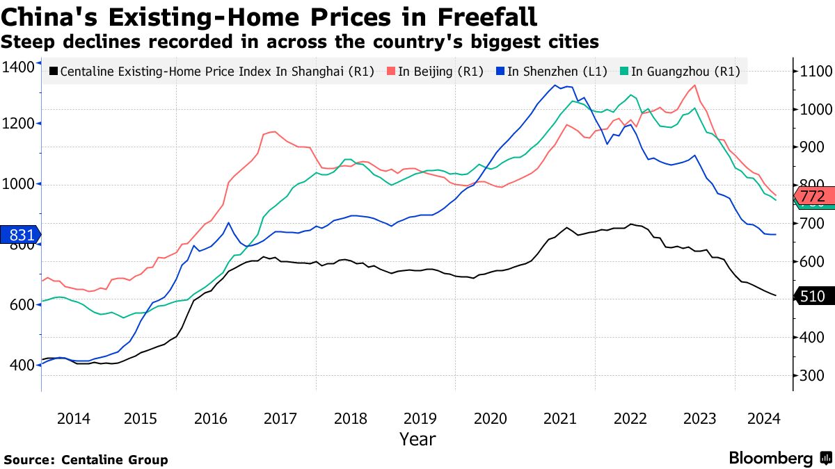 根据中原地产的数据,曾经是中国最不负担得起的城市深圳,二手房价格自2021年5月的峰值下跌了37%。在北京、上海和广州,二手房价格也分别从各自的峰值下跌了约27%。