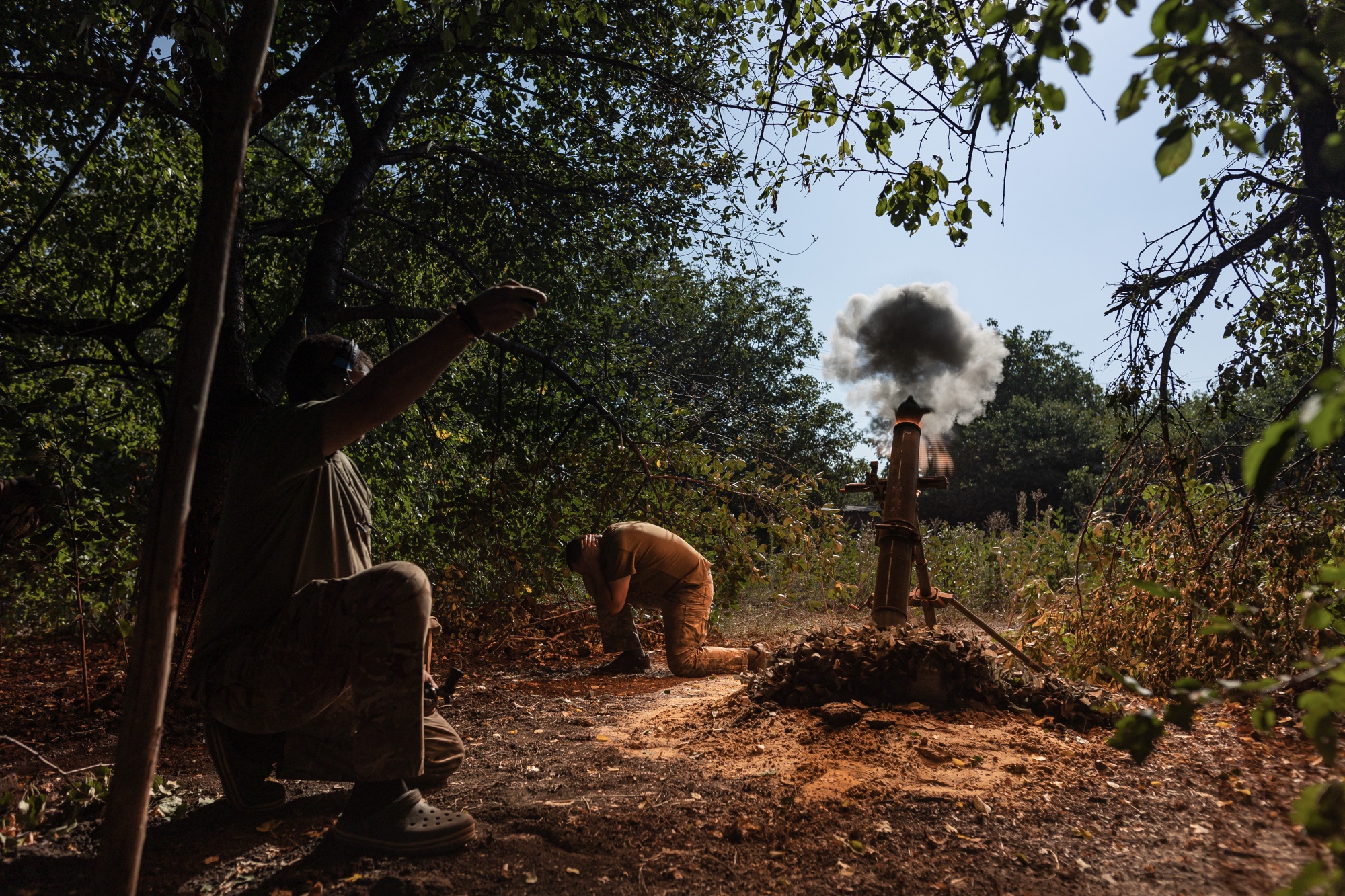 乌克兰一支迫击炮部队的士兵在8月18日向乌克兰托雷茨克发射迫击炮。