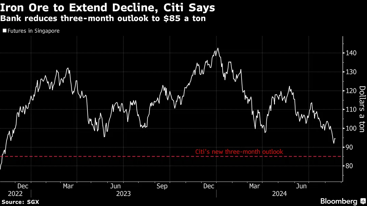 铁矿石有望进入每吨80美元的区间,延续下跌,因为中国的钢铁生产商减少产量,花旗集团表示,市场动态已经发生变化,并下调了价格预测。