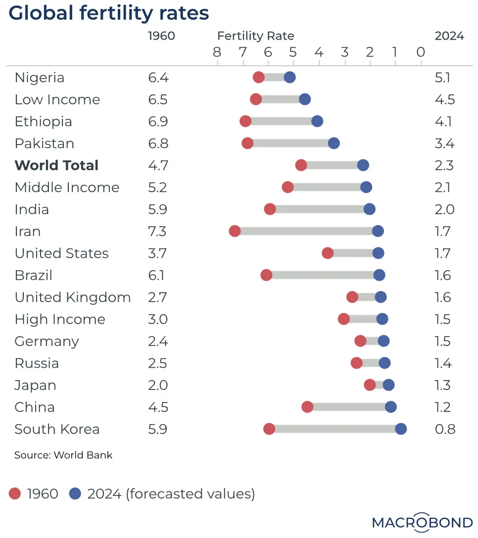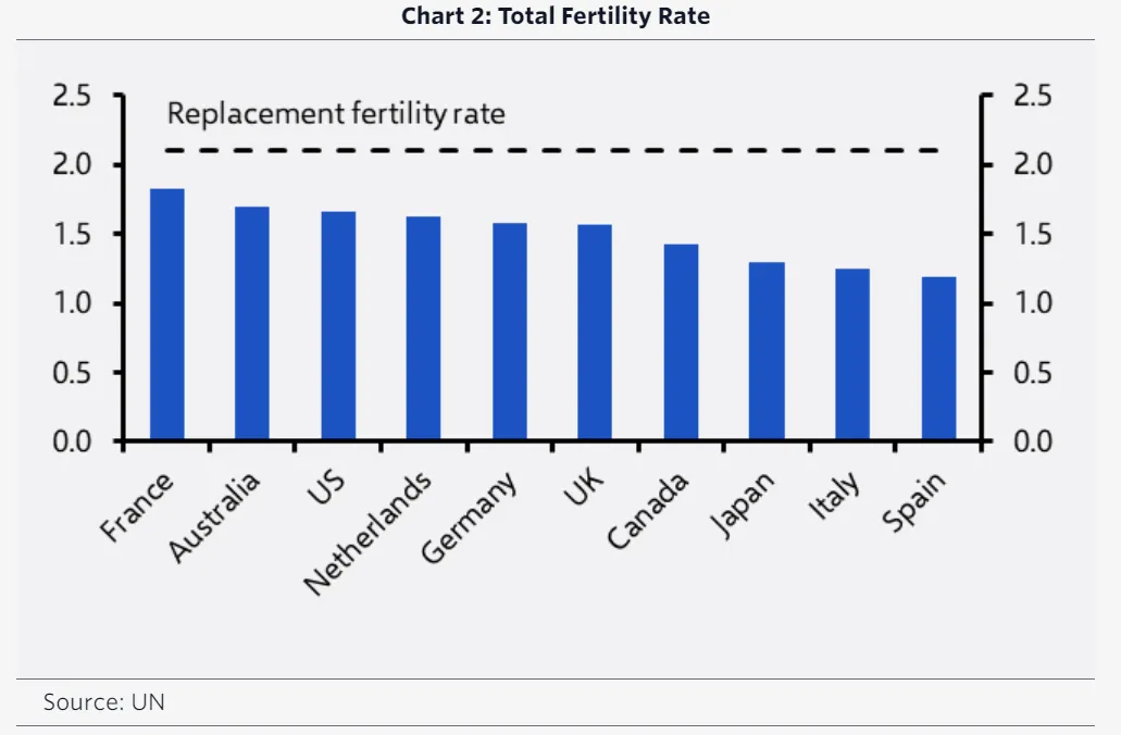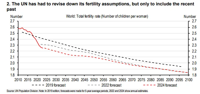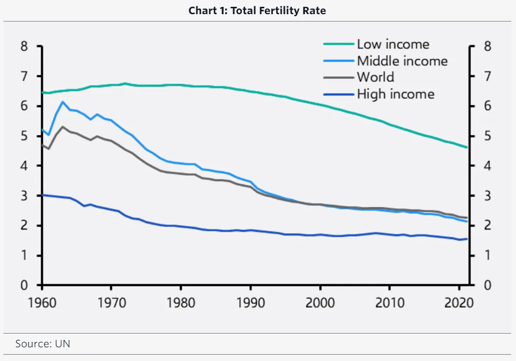 我们看到许多社会经济原因表明这一趋势可能会持续:住房和育儿成本增加,社会对生育的态度转变,以及由于经济条件改善和城市化而导致的新兴世界出生率下降。