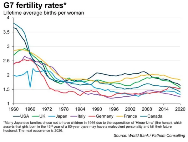 生育是一个痛苦而情感丰富的话题。共和党副总统候选人JD Vance对“无子女的猫女士”的批评使他陷入了政治麻烦;大约30年前,英国小说家P.D. James写下了一部可怕的小说,后来被改编成电影,《人类之子》,想象了在最后一个孩子出生25年后的社会。缺乏生育意味着缺乏未来。因此,经济和金融界正在以日益紧迫的态度研究生育率。富裕国家的生育率正在迅速下降——令人震惊。Fathom Consulting提供了自1960年以来G-7经济体的这张图表: