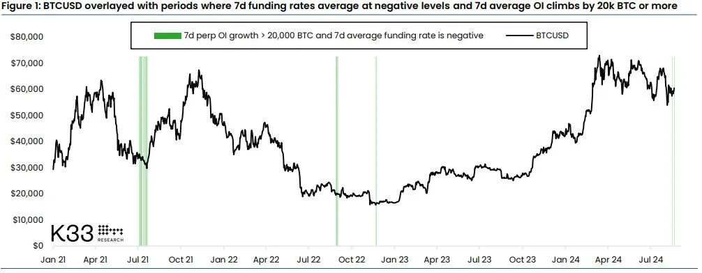 “上周,永久掉期的融资利率平均处于负值,而未平仓合约的兴趣大幅增加,”Vetle Lunde和David Zimmerman在K33分析中解释道。“这表明了激进的卖空行为,并在结构上创造了一个适合短期挤压的局面。”