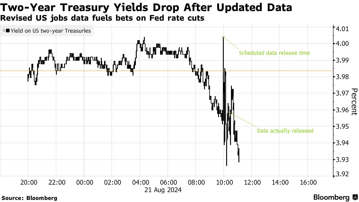 “这些修订给美联储在九月降息提供了另一个理由,”Curvature Securities固定收益交易主管托马斯·迪·加洛马表示。“由于这份报告,我倾向于在九月降息50个基点。我相信美联储会希望通过更大幅度的降息来安抚市场,作为他们的首次行动。”