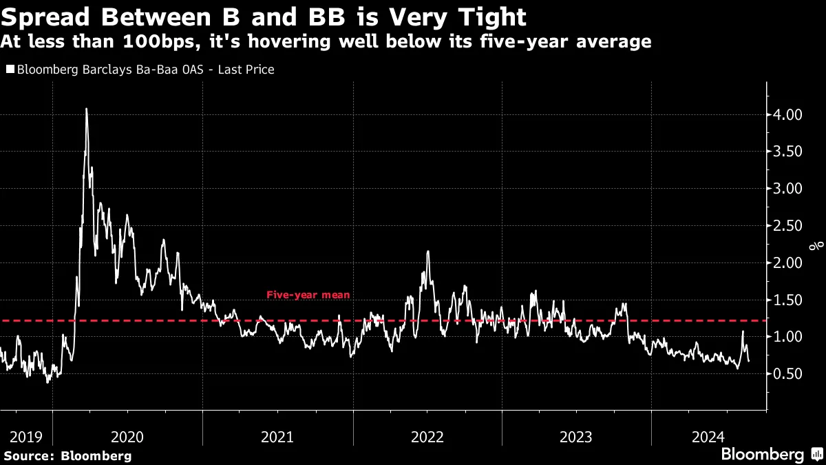 市场对B级债券相对于更高评级的BB债券几乎没有额外的风险溢价。这表明尽管本月早些时候经历了波动性冲击,但市场的自满情绪迅速回归。