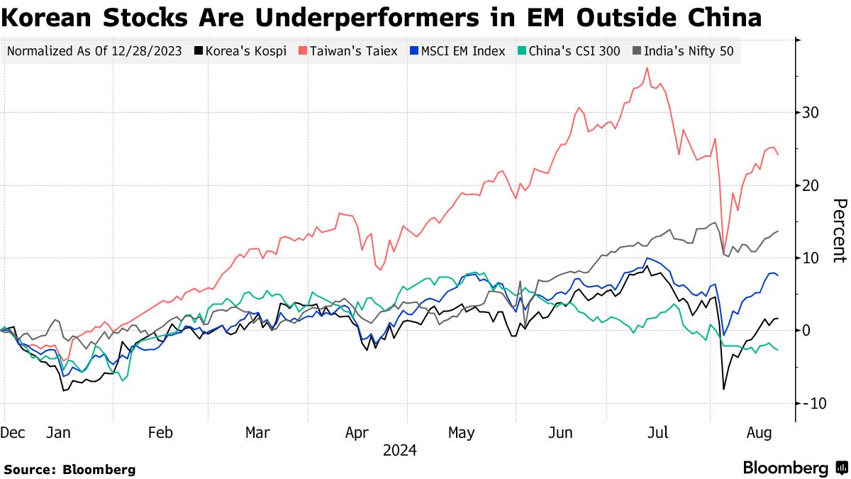 2024年, 韩国综合指数上涨不到2%,落后于台湾加权指数的24%涨幅和印度Nifty 50指数的14%涨幅。韩国基准股指的 表现不佳主要是由于该国最大股票三星电子的拖累,其股价在今年持平,因其在AI芯片业务上面临增长困难。