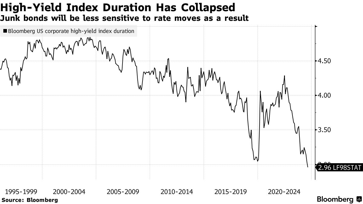 这是因为美国垃圾债券指数的久期——或对利率的敏感性——已降至历史最低水平,这意味着当美联储放松政策时,对债务价格的影响将更加温和。根据弗里德森的说法,垃圾债券发行减少、被赎回的债券减少以及来自更高质量公司的高收益债券集中度降低都导致了久期的下降,他是FridsonVision高收益策略的首席执行官。