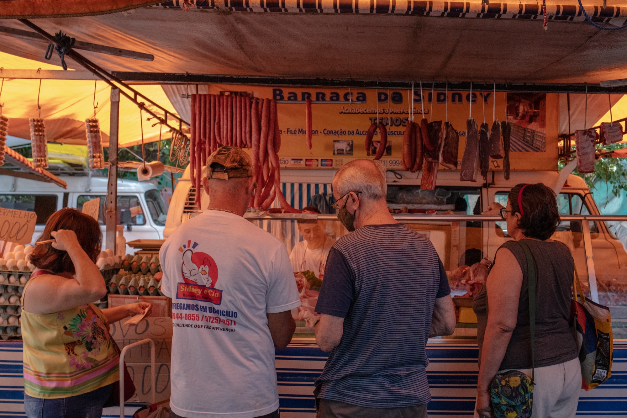 购物者在巴西里约热内卢的户外市场浏览肉类。