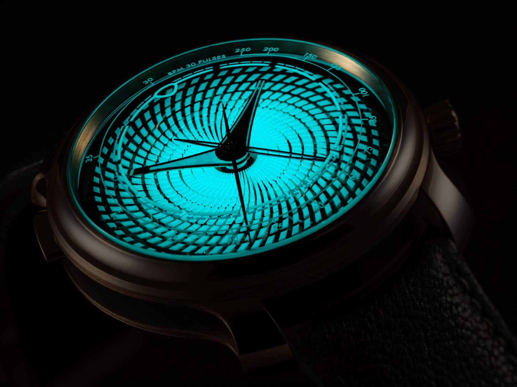 如果你在正常的日光下凝视刚刚发布的Ming 20.01系列3手表,你会轻松观察到分钟和小时指针。持续观察可能会揭示计时功能,而钟表爱好者可能会很快发现瞬时跳跃分钟的功能。但关掉灯光后,你将看到一种前所未见的视觉效果。一阵微小形状的发光阵列似乎在指针和机壳下的机械组件之间漂浮。总的来说,它看起来像是一个在旋转中暂停的螺旋星系。