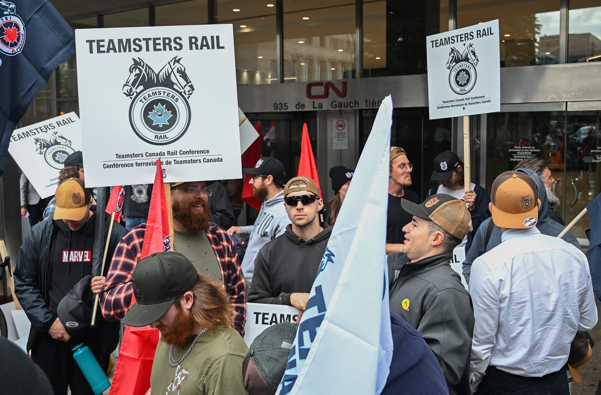 铁路工人和支持者在加拿大国家铁路公司总部前罢工,地点在魁北克省蒙特利尔,时间是8月22日。
