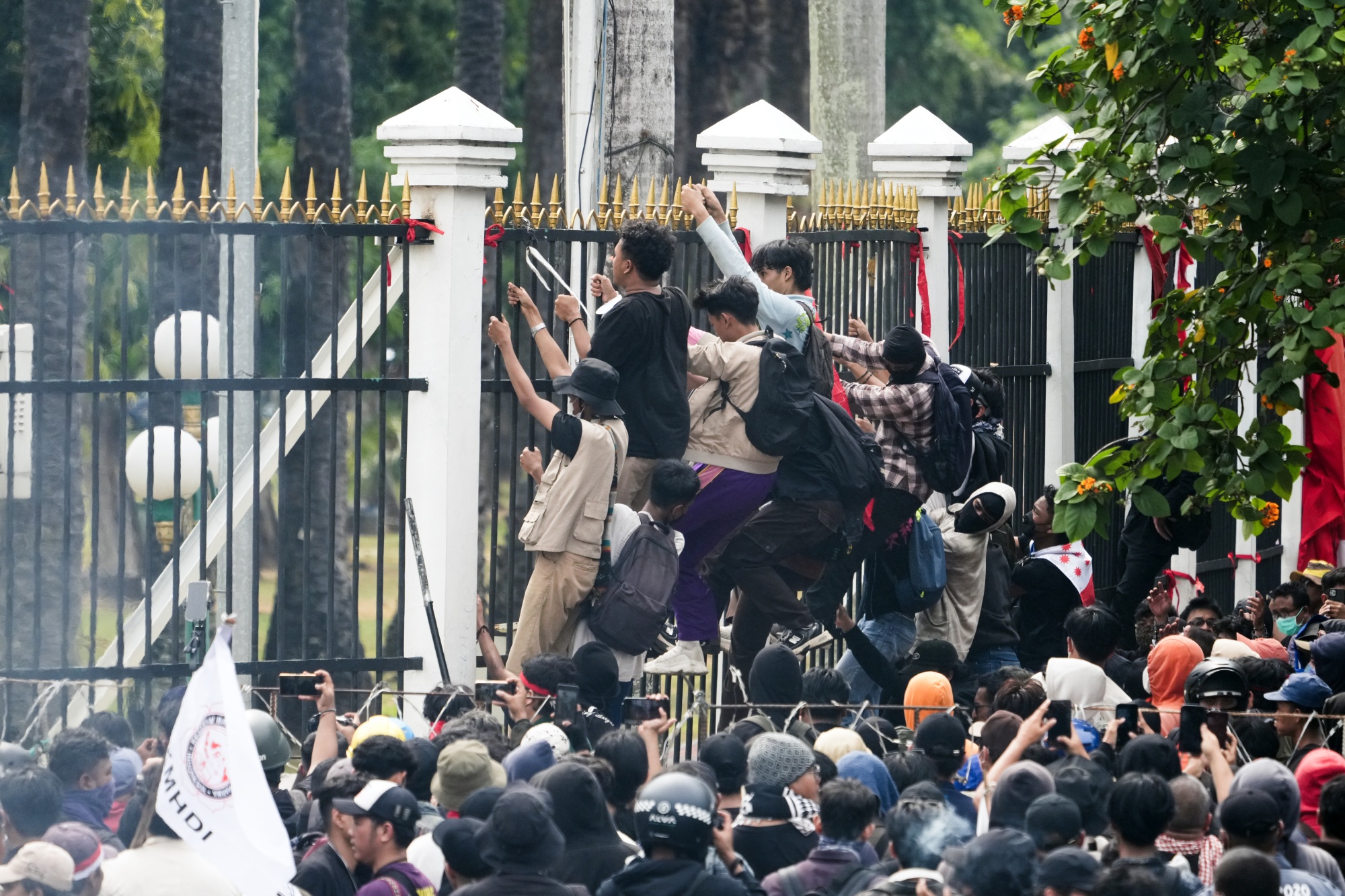 抗议者在雅加达的议会围栏上攀爬,时间是8月22日。摄影师:Dimas Ardian/Bloomberg在美联储政策转向的迹象日益明显之际,外国投资者急于购买印尼债券,周四并未受到该国亲民主抗议活动的影响。