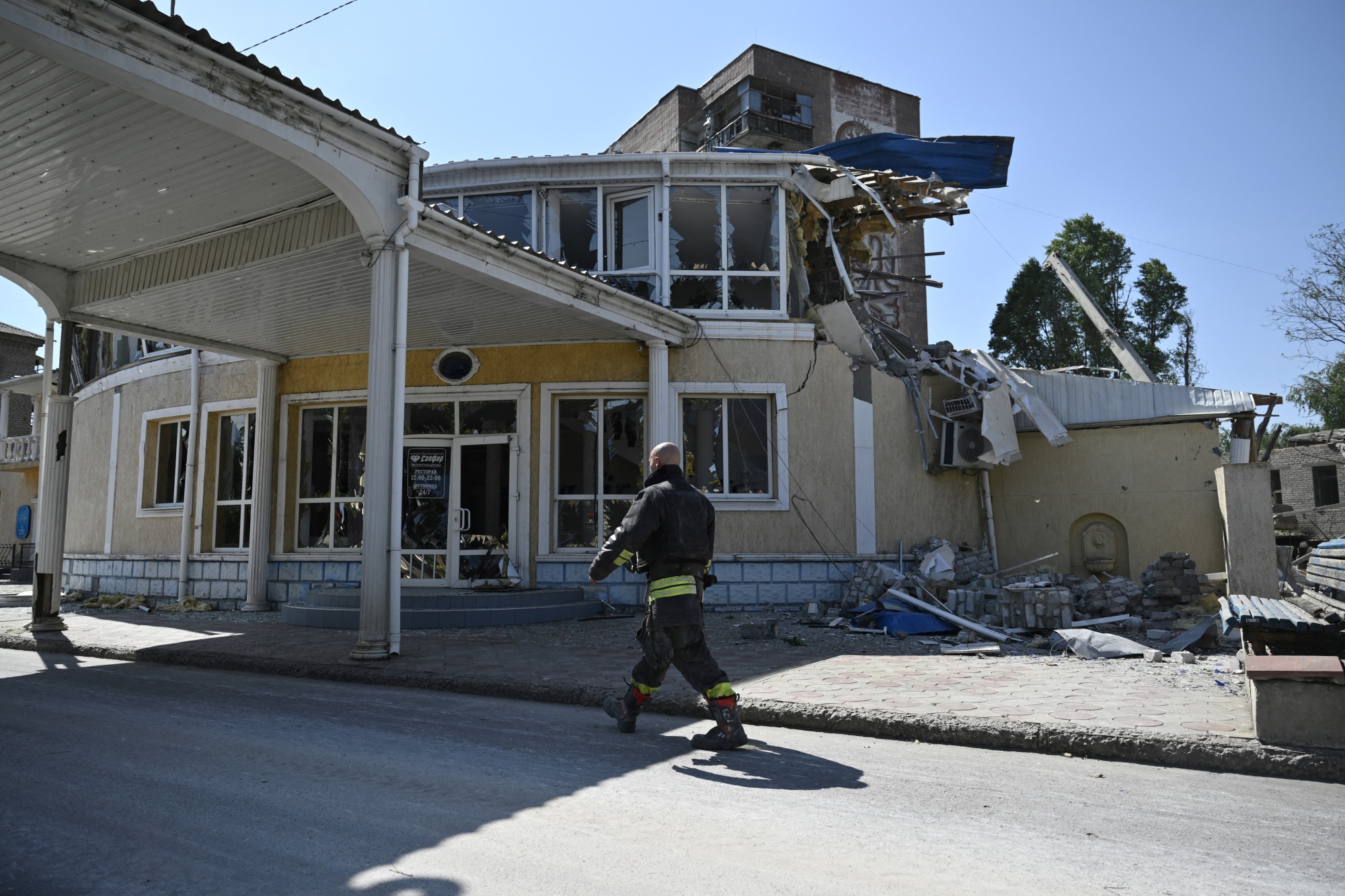 一名乌克兰救援人员在顿涅茨克地区克拉马托尔斯克镇的一家被毁酒店旁走过,时间是8月25日。