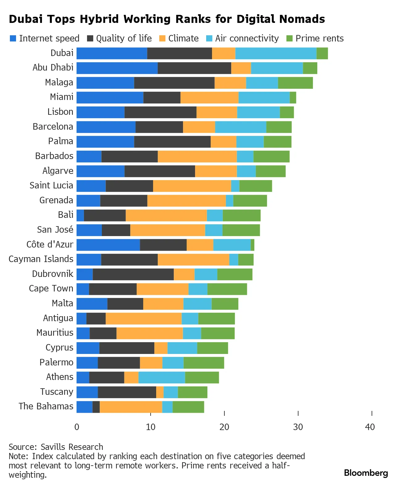 数字游民 在金融和咨询领域选择 阿联酋 作为他们的首选基地,理由是航空连接和现代基础设施。根据Savills的报告,迪拜和阿布扎比在吸引高级混合工作者方面在25个主要住宅市场中排名靠前。