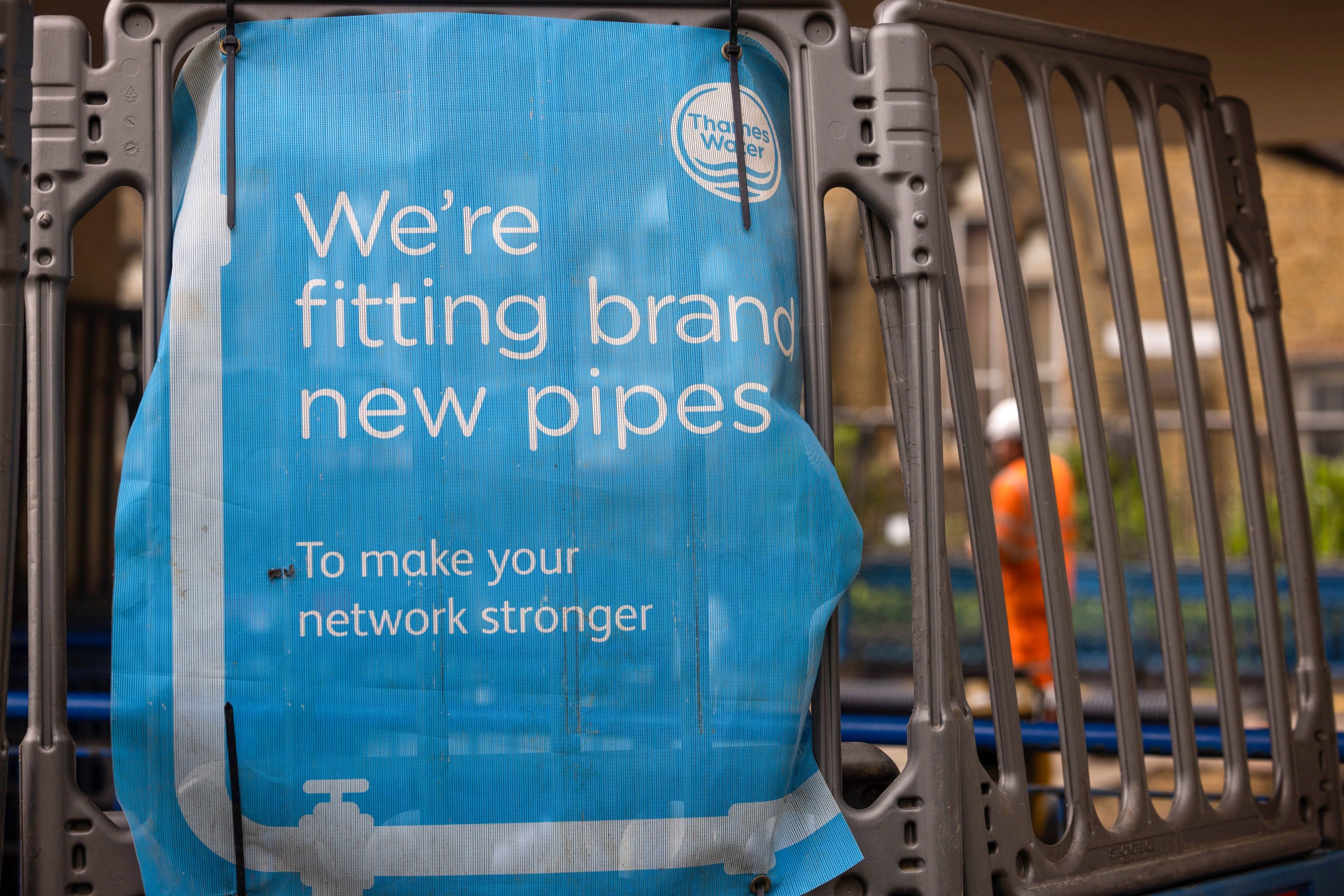 来自泰晤士水务有限公司的公共信息标志,关于伦敦水供应工程周围的保护屏障。摄影师:克里斯·拉特克利夫/彭博社泰晤士水务公用事业有限公司表示,到本十年末,它将不得不将账单提高多达59%,因为这家负债累累的公用事业公司急于吸引投资者以维持生存。