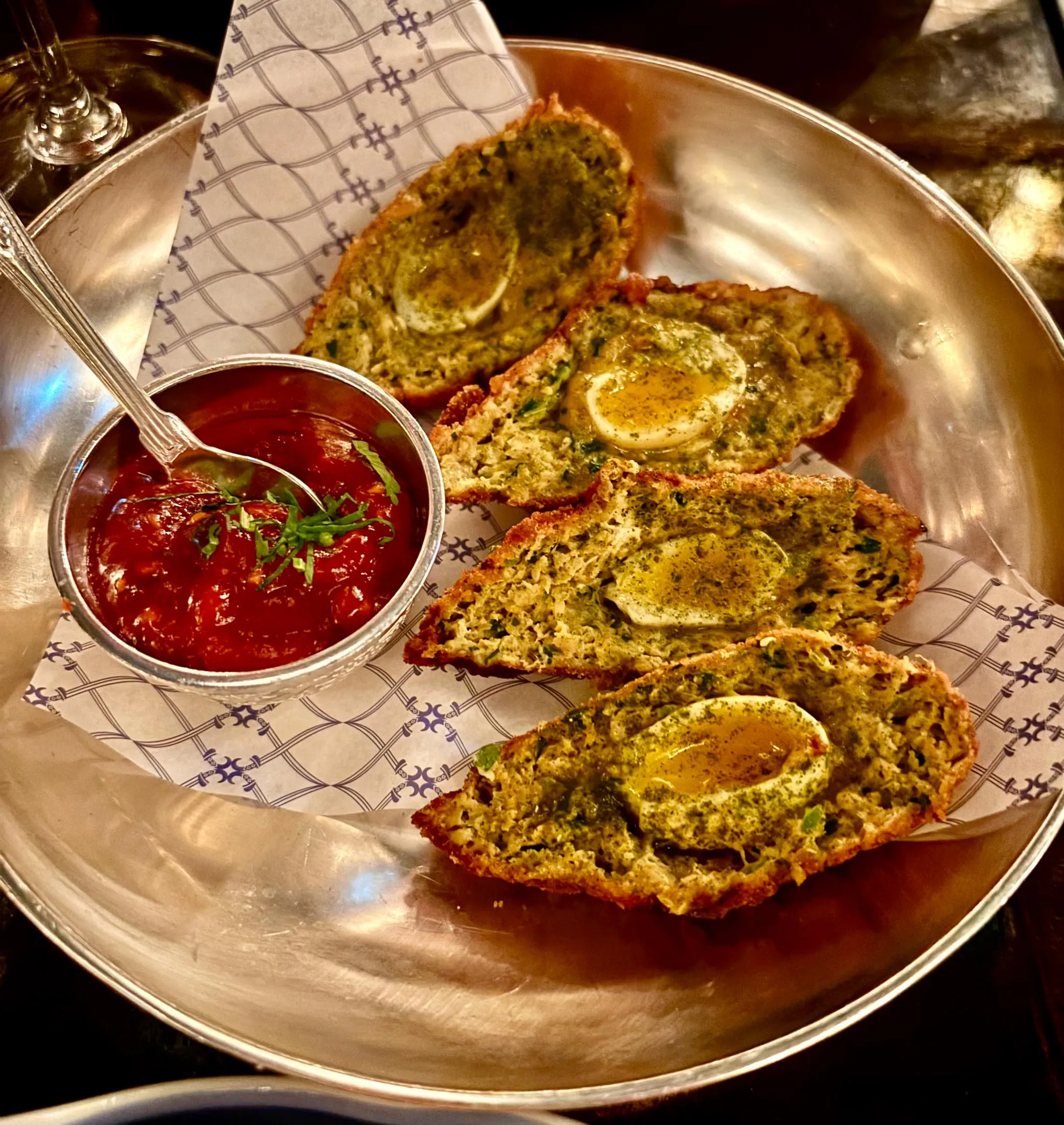 Nargisi鸡肉丸让人想起辛辣的苏格兰蛋。摄影师:Kate Krader/ Bloomberg### 你将要吃的东西