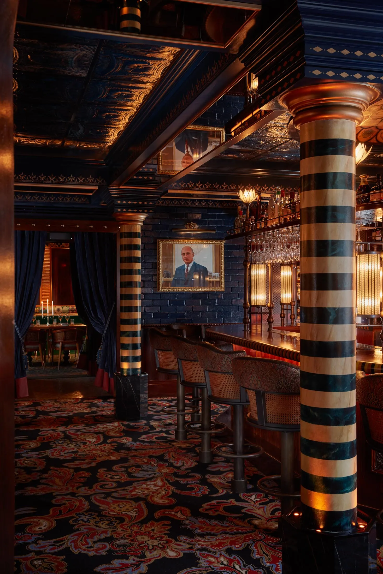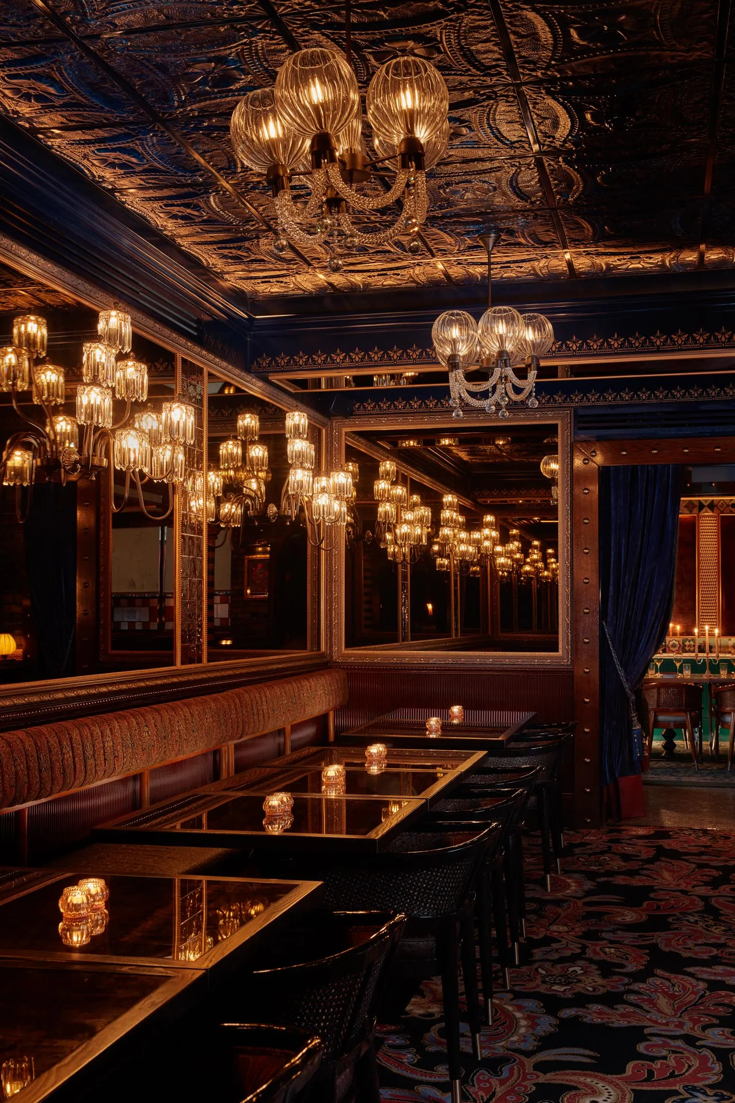 一楼和楼下的高能氛围,楼下是一个如珠宝盒般的空间,设有一个闪闪发光的酒吧、几张桌子和一些伦敦最时尚的私人餐厅。