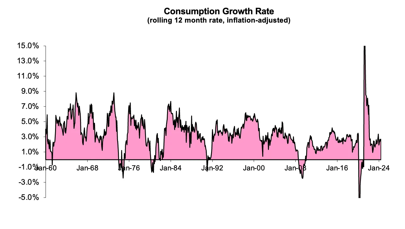 这是因为人们有账单要支付。因此,即使在衰退期间,消费模式也不会发生巨大变化。全球金融危机和疫情是消费实际收缩的少数几次情况。这告诉你这些事件有多么灾难性。
