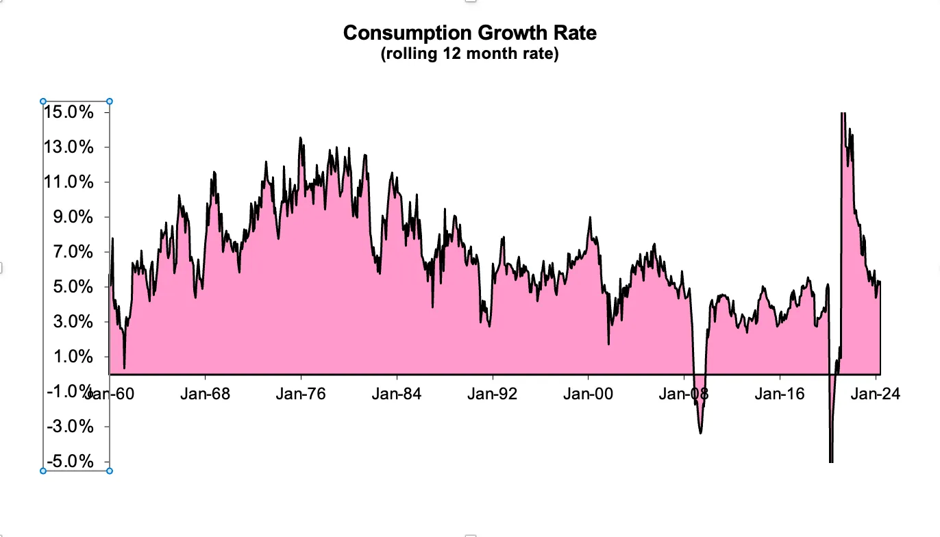 那么这让我们现在处于什么状态呢?在我看来,我们所拥有的是经过通货膨胀调整的消费者支出增长,从极高水平回落到正常水平。现在还没有什么好担心的。