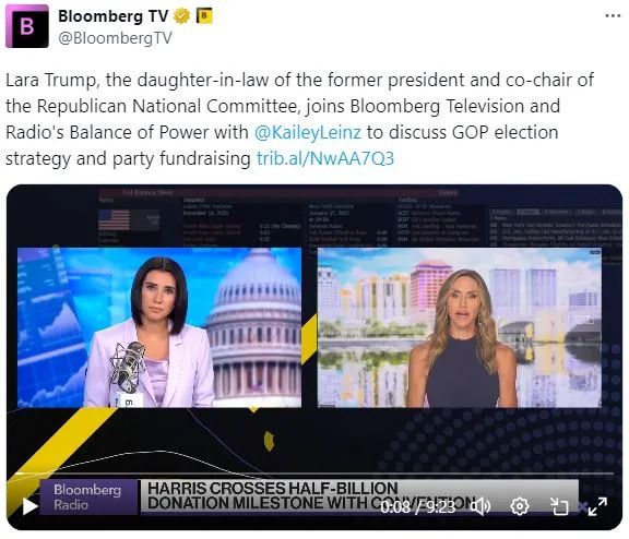今天在彭博电视台的 权力平衡 早间版中,主持人凯莉·莱因兹采访了前总统的儿媳、共和党全国委员会的联合主席拉拉·特朗普,讨论 共和党的战略和筹款。