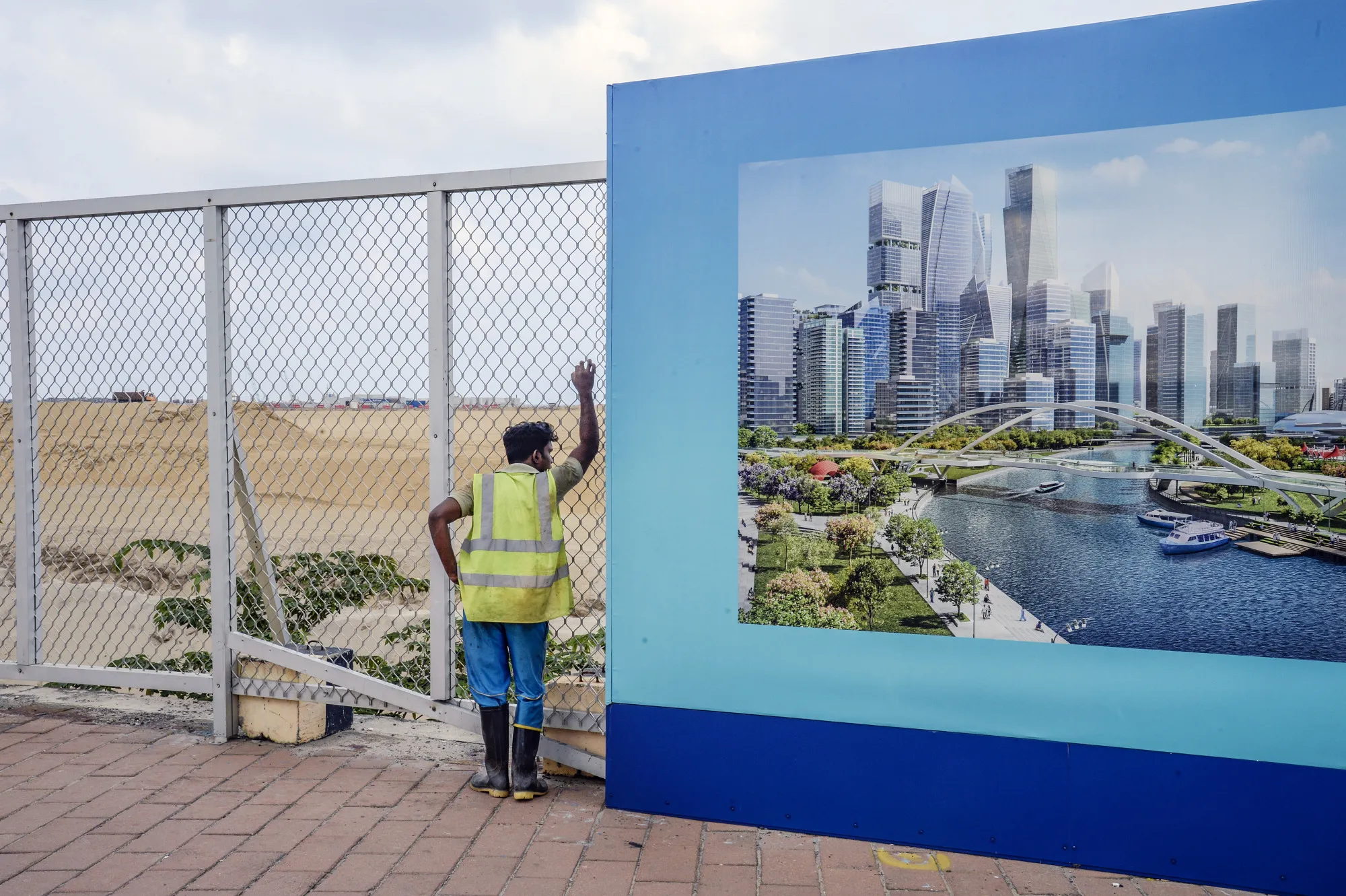 2018年,在科伦坡,工人在科伦坡港口城市的工地上,旁边是中国港湾工程公司开发的科伦坡国际金融城项目的广告牌。摄影师:阿图尔·洛克(Atul Loke)/彭博社阿马拉苏里亚在科伦坡的采访中表示:“我们不希望轻松的钱流入以资助无效项目,并且不关心腐败。我们对任何国家的期望都是如此,我们希望与中国的关系也是如此。”