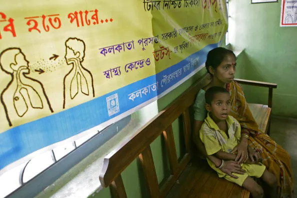 一位女性带着她的孩子,一名肺结核患者,在加尔各答郊区的医院等待检查。