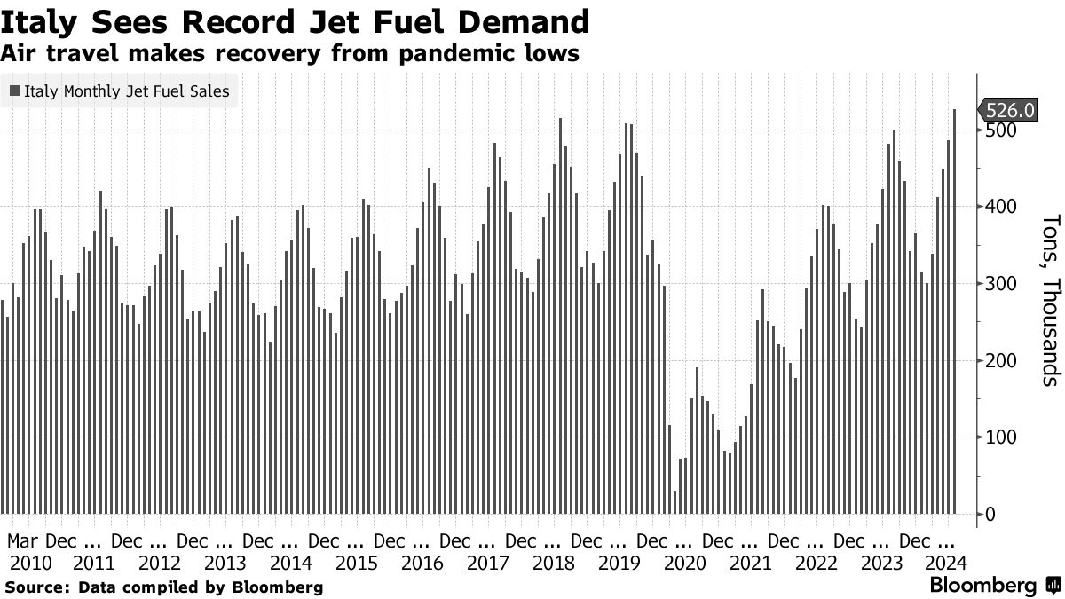 意大利上个月的航空燃料销售达到了至少22年来的最高水平,这表明欧洲市场在经历了多年从新冠疫情缓慢复苏后,正回归稳健增长。