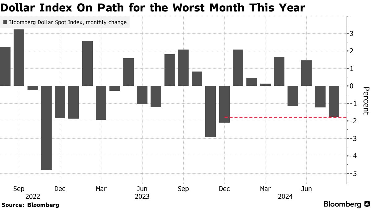 如此大的波动发生在一个动荡的$7.5万亿的每日货币市场中。美元的下滑受到了一段短暂的市场动荡和八月初日本套利交易的撤离的推动。上周美联储主席杰罗姆·鲍威尔表示是时候开始降息时,美元进一步下跌,尽管此后有所回升。