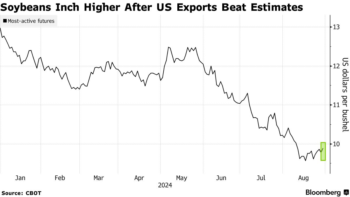 11月交割的期货价格上涨了1.6%,是超过一周以来最大的盘中涨幅,扭转了前一天的下跌。美国出口销售在截至8月22日的一周内上升至247.2万吨,超出分析师的预测,接近最高估计。即将到来的营销年度的销售是自2023年7月以来最强劲的。