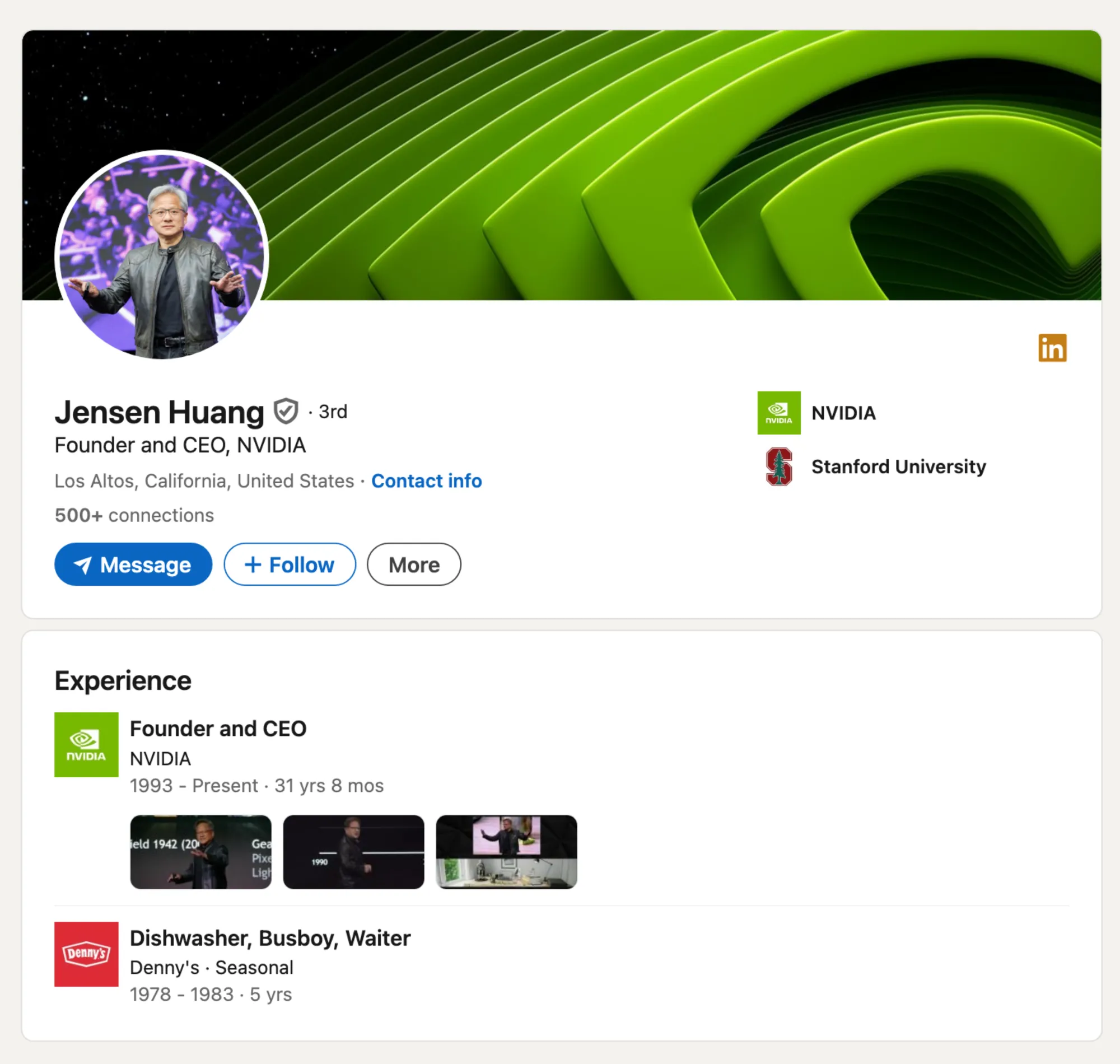 好吧,他不再是黄仁勋 了。但是在1978年到1983年这五年里,这位后来创办了 全球最有价值公司的人曾在Denny’s当洗碗工,这一点在他的 LinkedIn 个人资料中得到了证明。多年后,他会回到同一家Denny’s,和他的 朋友克里斯·马拉霍斯基和库尔特·普里姆坐在一个包厢里, 决定创办Nvidia。
