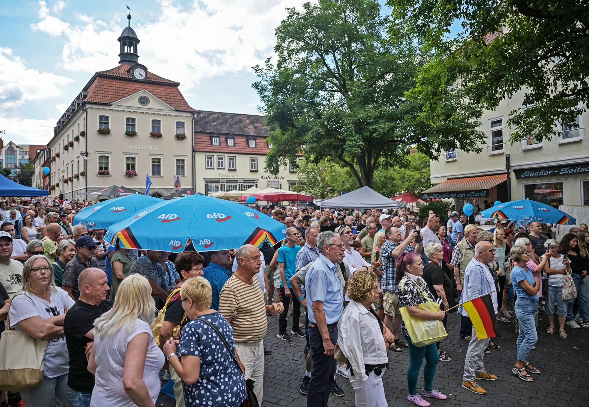 在德国东部一个温泉小镇的一个阳光明媚的日子里,烤香肠的气味弥漫在空气中,几百名当地居民在一个装饰着蓝色横幅的舞台附近徘徊,孩子们的脸被画成小丑或动物的样子。